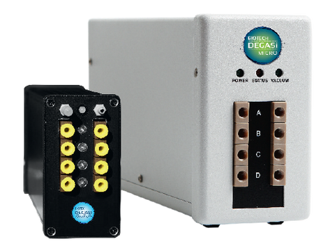 DEGASi Compact is available with 2, 4 or 6 degassing channels in a housing with only 167×56 mm footprint. This is possible due to the development of a new single stage vacuum pump with a small built in control board and new 285μl Systec AF™ vacuum chambers.